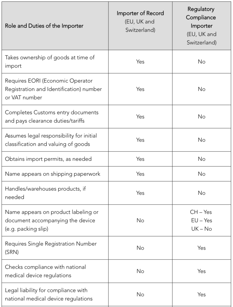 If you export devices to the European Union, United Kingdom or Switzerland, you will need to appoint an Importer of Record. Understandably, many medical device and IVD manufacturers confuse the Importer of Record role with the regulatory compliance importer. The regulatory compliance importer is the economic operator under Article 13 of the EU MDR and IVDR which applies to the EU, UK and Switzerland. In contrast, the Importer of Record (IOR) is the first touch point for your goods when they enter the EU, UK or Switzerland. They clear your product through Customs and pay duties/tariffs/fees.